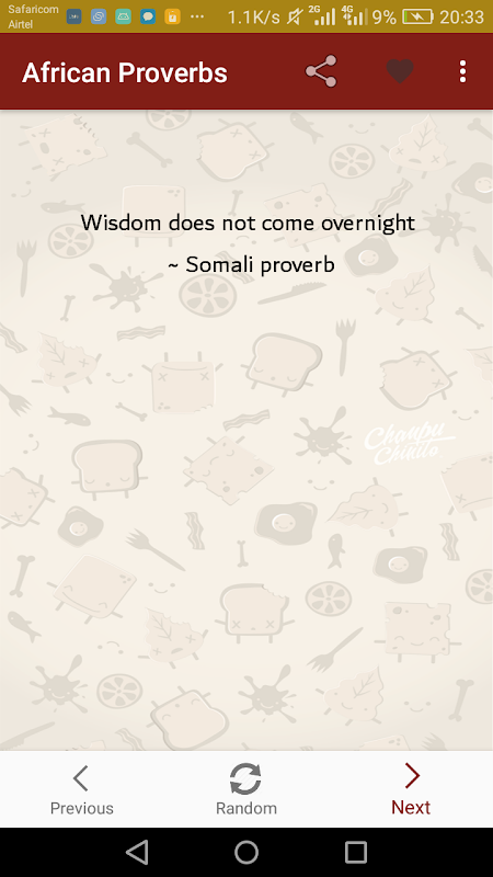 The proverbs in the app have been carefully selected from the best of African culture. Included in the app are Ethiopian Proverbs, Kenyan Proverbs, Swahili Proverbs, Nigerian Proverbs, Malian Proverbs, Somali Proverbs, Kanuri Proverbs, Senegalese Proverbs, Ashanti People of Ghana, Kikuyu, Kaonde, Madagascar Proverbs and many more.