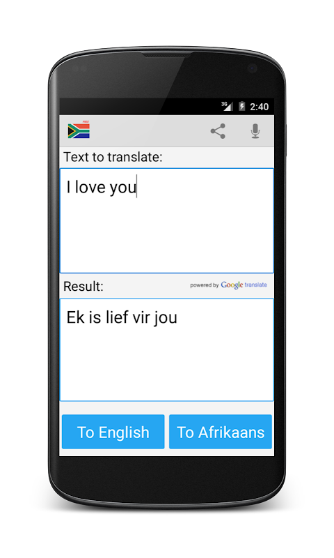 Ứng dụng miễn phí này có thể dịch các từ và các văn bản từ tiếng Anh (hoặc tiếng việt) để Afrikaans, và từ Afrikaans tiếng anh. Ứng dụng rất hữu ích cho dịch dễ dàng và nhanh chóng, mà cũng làm việc như một từ điển!