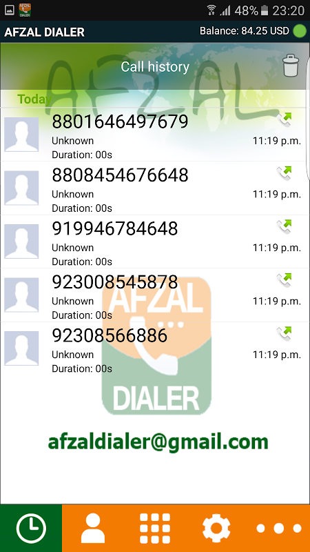 4. Launch the Afzal Dialer app and dial destination number using any of the Dial formats or directly from Contact list.