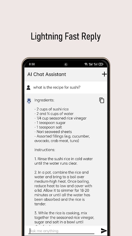 Hơn nữa, Trợ lý trò chuyện AI cũng có thể hỗ trợ bạn các công việc liên quan đến gia đình. Từ việc tìm công thức nấu ăn tốt nhất đến chuẩn bị bữa ăn, đến đề xuất ý tưởng cải thiện nhà cửa hay đề xuất cách trang trí hoàn hảo cho phòng khách của bạn, chatbot của chúng tôi có thể cung cấp cho bạn những lời khuyên và lời khuyên hữu ích. Với Trợ lý trò chuyện AI, bạn có thể dễ dàng truy cập thông tin bạn cần để biến ngôi nhà của bạn thành một nơi thoải mái và thú vị hơn. Cho dù bạn đang tìm kiếm các thủ thuật dọn dẹp nhanh chóng hay cần trợ giúp sắp xếp không gian của mình, ứng dụng của chúng tôi đều có thể giúp bạn. Vì vậy, tại sao phải chờ đợi? Tải xuống Trợ lý trò chuyện AI ngay hôm nay và trải nghiệm sự tiện lợi khi có trợ lý cá nhân tại nhà ngay trong tầm tay bạn.
