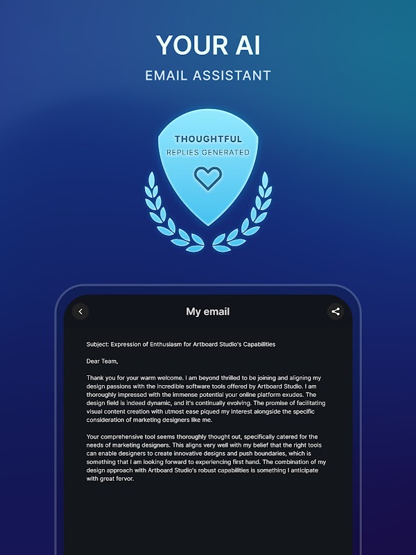 Khám phá sức mạnh của giao tiếp được tăng cường bởi AI với ứng dụng Trợ lý Email của chúng tôi. Được thiết kế để hợp lý hóa quy trình soạn email của bạn, ứng dụng của chúng tôi cho phép bạn dễ dàng tạo các email và phản hồi hấp dẫn. Hoàn hảo cho cả việc soạn email mới và trả lời tin nhắn, trình tạo dựa trên AI của chúng tôi lấy thông tin đầu vào của bạn và biến nó thành nội dung được viết hoàn hảo.