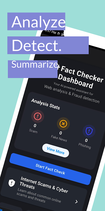 Dán hoặc chia sẻ bất kỳ văn bản hoặc URL nào. Ứng dụng sẽ kiểm tra các dấu hiệu gian lận, thông tin sai lệch hoặc lừa đảo và cung cấp cho bạn bản tóm tắt với các tham chiếu đáng tin cậy. Bạn có thể xem lại lịch sử phân tích, chuyển đổi giữa các mô hình AI và thậm chí tùy chỉnh cách ứng dụng phân tích nội dung.