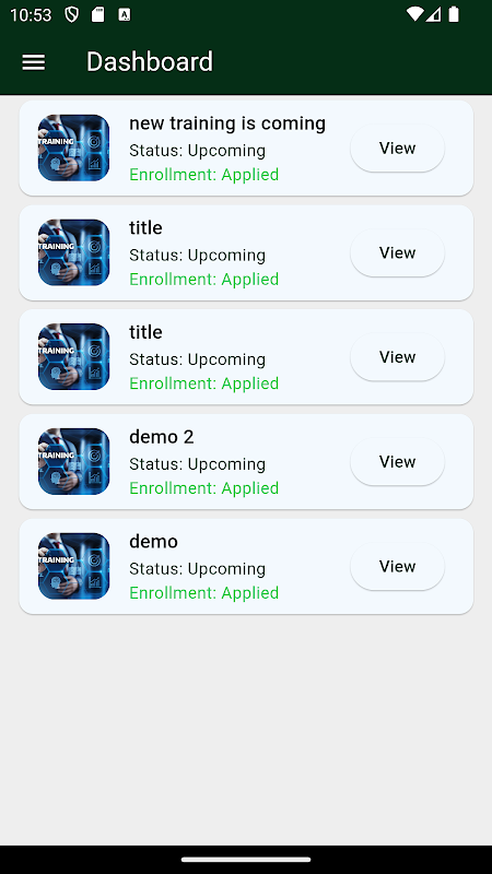 Quy trình đăng ký đơn giản: Đăng ký trực tiếp các khóa đào tạo bạn mong muốn thông qua ứng dụng. Gửi đơn đăng ký của bạn một cách dễ dàng và theo dõi trạng thái của nó trong thời gian thực.
