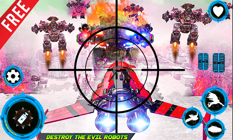 In Air Jet Robot Transformation :Real Robot Shooting Game you will have to perform jet attack & Jet fight air combat missions in the air space of futuristic robot city. This Flying Robot air plane is a unique transforming robot game unlike other robot cars or super robot fighter plane games. In the US Army robot jet game, you will fly as a US air force jet in a special jet air plane designed for an air robot battle arena. In the robot transformation game, you will battle against super robots and their leader flying robot waging robot wars in the air space of futuristic robot city.