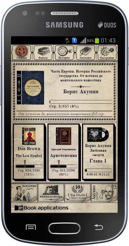 Akunin Book позволяет читать любые книги в нижеприведенных форматах и содержит: