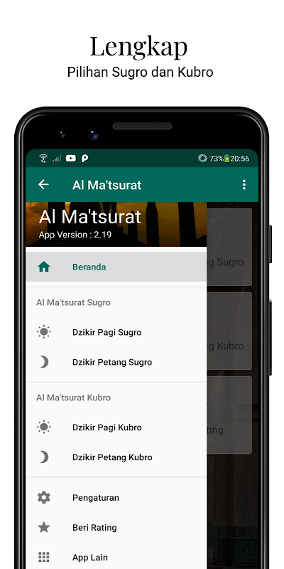 Kumpulan dzikir pagi dan petang Al Ma'tsurat yang disusun dalam sebuah aplikasi Android ini untuk memudahkan kita mengamalkan dzikir pagi hari dan dzikir sore hari.