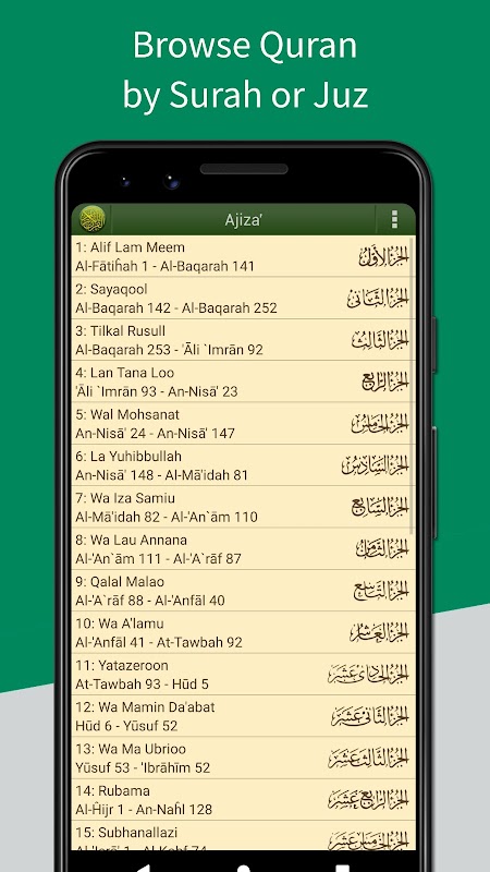 - Vuốt từ trái sang phải để chuyển đến surah trước hoặc từ phải sang trái để chuyển đến surah tiếp theo.