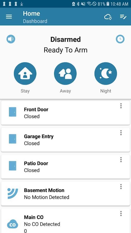 Nhận trạng thái cảnh báo theo thời gian thực và kích hoạt hoặc vô hiệu hóa hệ thống an ninh của bạn từ xa. Nhận thông báo tức thì trong trường hợp có báo động an ninh hoặc được thông báo khi gia đình bạn về đến nhà.