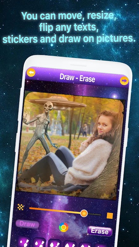 Trải nghiệm cuộc xâm lược của người ngoài hành tinh ngay từ đầu với ứng dụng Trěnh Chỉnh Sửa Ảnh Máy Ảnh Đĩa Bay. Máy ảnh ảnh người ngoài hành tinh này là một trong những ứng dụng chỉnh sửa ảnh thú vị nhất sẽ giúp bạn tạo ra những bức ảnh đẹp với đĩa bay trên các bức ảnh. Thêm người ngoài hành tinh vào ảnh và cung cấp cho hình ảnh của bạn một cái nhìn hoàn toàn khác. Mở máy ảnh ảnh đĩa bay này, chụp ảnh hoặc tải nó lên từ thiết bị của bạn và bắt đầu chỉnh sửa ảnh. Thêm nhãn dán người ngoài hành tinh đẹp cho hình ảnh và tạo ra những bức ảnh không thể tin được mà bạn có thể chia sẻ trên phương tiện truyền thông xã hội và nhận được rất nhiều lượt thích cũng như bình luận. Nếu bạn là một fan hâm mộ của phim khoa học viễn tưởng, thì bạn phải thử ứng dụng chỉnh sửa ảnh người ngoài hành tinh này. Tải xuống một trong những ứng dụng chỉnh sửa ảnh tuyệt vời nhất và tạo ra hình ảnh tàu vũ trụ ngoài hành tinh hoàn toàn miễn phí.