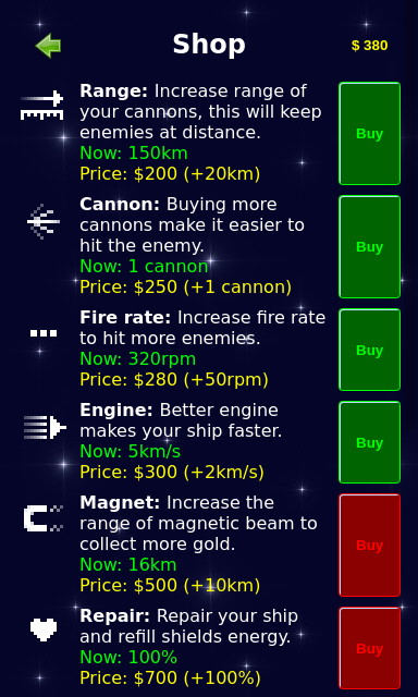 mua cải tiến tàu trong cửa hàng. Người ngoài hành tinh gây thiệt hại cho tàu khi họ