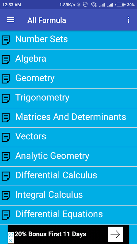 Nếu bạn Loves Toán, thì đây "All in One Formula Math" ứng dụng sẽ là những người bạn bình thường của bạn. Bạn sẽ nhận được hơn 1000 công thức toán học và phương trình ở một nơi. Bạn không cần bất kỳ ứng dụng hoặc Sách khác để có được công thức toán học.