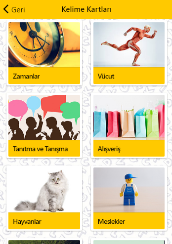 Nằm trong chủ đề: Ngày, tháng, số, phương hướng, hình dạng, màu sắc, thời gian, cơ thể, nhận biết và hẹn hò, mua sắm, đồ dùng nấu ăn, động vật và các dấu hiệu (tín hiệu giao thông)