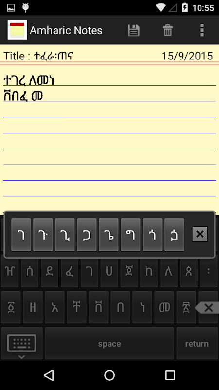 Just touch the Amahric Feedel (Alphabet) for 1 second to type or 2 seconds to choose between all the different variations of the Feedel in Amharic Notes. Taking notes in Amharic, the official language of Ethiopia, has never been easier. With our custom Keyboard you can type 90% of the Amharic Alphabet and Numbers and Punctuations too. Beautifully laid out, easy to use and very intuitive. Choose whether to save or discard your note. Easily keep track of your reminders, notes or todo list in Amharic. Available for the first time on Android. For Free. So tell all your friends and remember to rate us in the Google Play Store.
