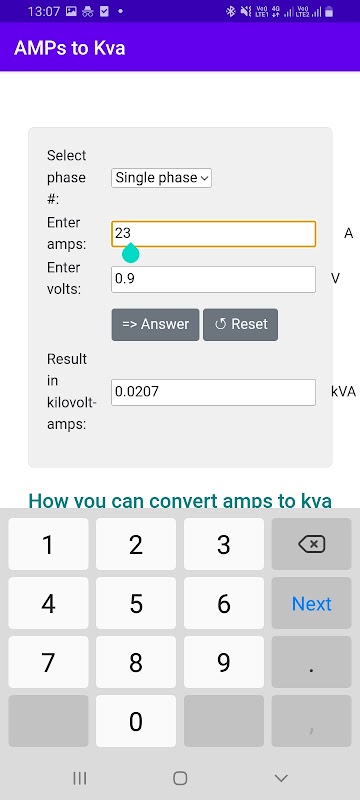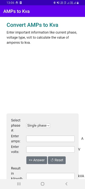 Chuyển đổi Ampe thành kva (kilovolt-ampere) được thực hiện dễ dàng với ứng dụng này