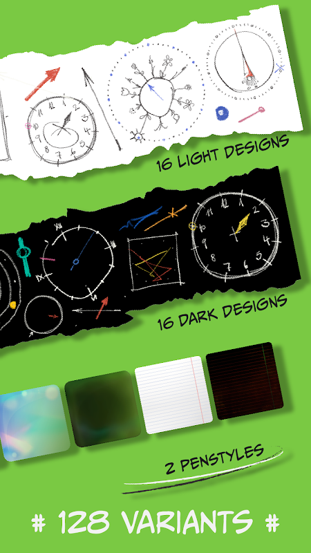 Bạn sẽ nhận được một bộ sưu tập hơn 100 biến thể của thiết kế vật dụng dưới dạng đồng hồ kim được vẽ tay. Những chiếc đồng hồ đơn giản, nguệch ngoạc được thiết kế dễ thương và chúng sẽ mang đến cho màn hình của bạn một diện mạo hiện đại nhưng không kém phần độc đáo. Ngoài ra, bạn có quyền truy cập bằng 1 cú nhấp chuột vào chức năng báo thức và lịch của thiết bị. Bộ sưu tập tiện ích đồng hồ chữ viết nguệch ngoạc Analog này được tối ưu hóa cho hiệu quả và tiết kiệm năng lượng, đồng thời hoàn toàn phù hợp với hệ điều hành của điện thoại di động của bạn. Hãy sáng tạo và cung cấp cho màn hình của bạn một thiết kế mới và độc đáo!