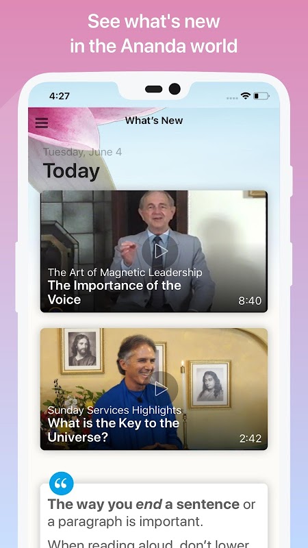 Làm sống động cuộc sống tinh thần của bạn với cảm hứng hàng ngày dựa trên những lời dạy của Paramhansa Yogananda. Dễ dàng tìm thấy các sự kiện xảy ra gần bạn và khám phá các video nâng cao mới nhất, bài đăng trên blog và hơn thế nữa từ Ananda Worldwide.