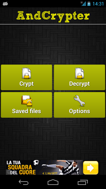 AndCrypter is an application that lets you easily create encrypted text messages using an encryption key. You can then send or save messages into files that you can open whenever you want. Without the key that has originally created the massage is impossible to decypher it, so noone can watch your saved files or understand your secret conversations.