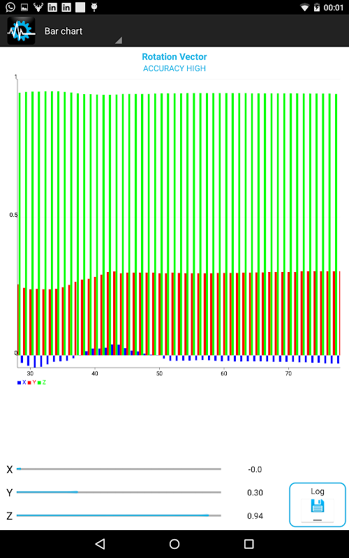 Xem trong một màn hình duy nhất các dữ liệu từ các cảm biến của thiết bị tất cả trong thời gian thực. Đồ họa và hiển thị văn bản có sẵn cho mỗi cảm biến (đồ thị không có sẵn cho khoảng cách, vị trí và thông tin pin).