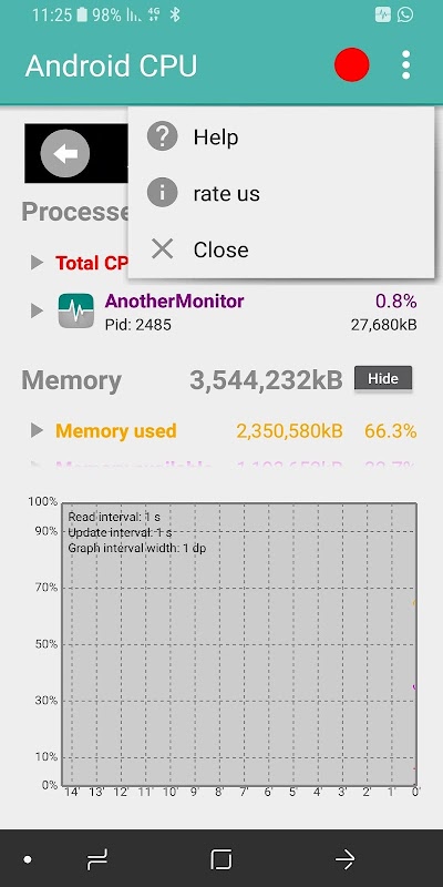 màn hình CPU Android và ghi lại CPU và bộ nhớ sử dụng các thiết bị Android.