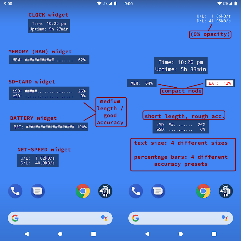 Tất cả thông tin quan trọng bạn cần ngay trên Màn hình chính của mình: Bao gồm Đồng hồ, Ngày, Thời gian Hoạt động (Uptime), RAM, Lưu trữ, Pin, Tốc độ Mạng và Đèn pin.