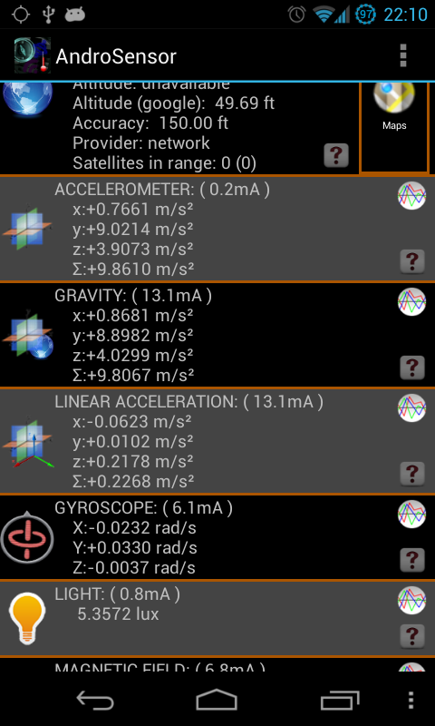 AndroSensor hỗ trợ tất cả các cảm biến thiết bị Android có thể có và nó sẽ nói cho bạn biết họ không được hỗ trợ bởi phần cứng của bạn.