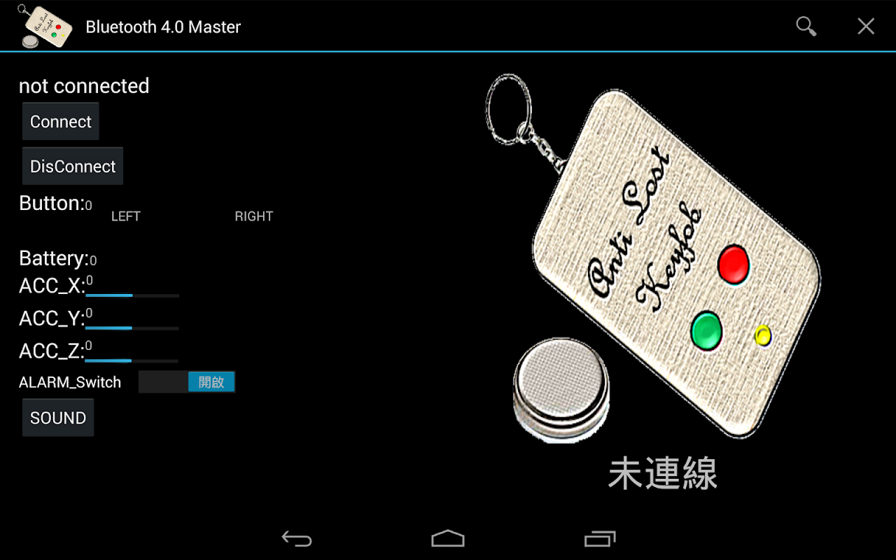 如果連接的藍芽4.0 BLE裝置有遺失或發生震動,則本APP會發出警示音樂,藍芽4.0 BLE裝置也會Alarm。