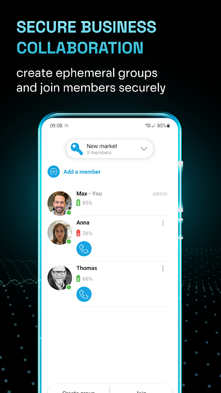 Giao tiếp và trao đổi dữ liệu diễn ra trong các nhóm kín chỉ có sẵn khi có lời mời. Mã lời mời chỉ có giá trị một lần và trong một giờ.