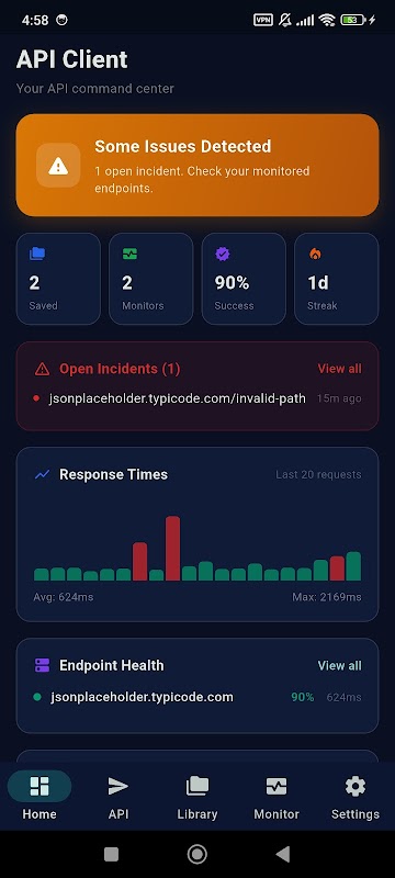 Thiết lập kiểm tra sức khỏe tự động cho các điểm cuối của bạn. Nhận thông báo đẩy khi API gặp sự cố hoặc suy giảm hiệu suất. Theo dõi sự cố và thời gian phục hồi.