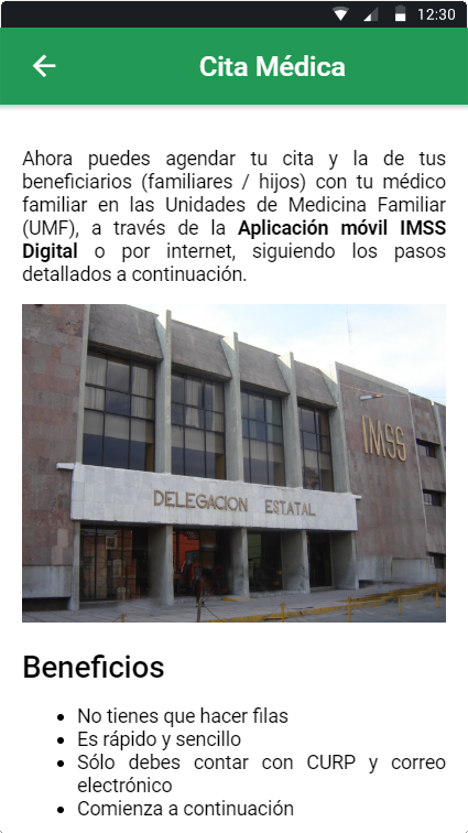 Ứng dụng này được trình bày dưới dạng một dịch vụ công cộng để giúp người lao động Mexico tìm hiểu cách yêu cầu một cuộc hẹn trực tuyến tại IMSS.