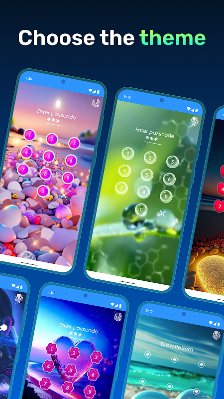 Ứng dụng khóa mật khẩu Applock này có mẫu và mã PIN có nhiều chủ đề trong cửa hàng chủ đề. Chọn chủ đề bạn muốn áp dụng. Bộ sưu tập đa dạng của chủ đề trong cửa hàng chủ đề.