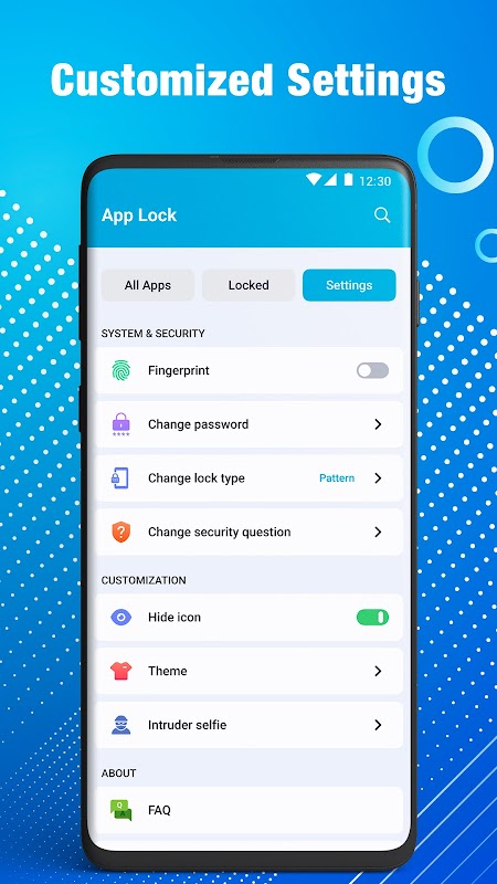 - App Lock có thể khóa ảnh của bạn, phòng trưng bày và tin nhắn từ con mắt tò mò và bạn bè tò mò. Để bảo vệ sự riêng tư của bạn!