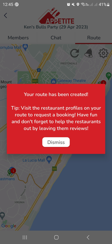Một tính năng nổi bật của Ứng dụng Appetite là chức năng lập kế hoạch lộ trình sáng tạo. Điều phối các chuyến đi dễ dàng bằng cách tạo lộ trình, thêm ưu đãi, mời bạn bè và quản lý mọi thứ trực tiếp thông qua ứng dụng. Từ việc đặt chỗ và trò chuyện với các cơ sở cho đến liên lạc trong nhóm của bạn, ứng dụng sẽ hợp lý hóa toàn bộ quy trình. Ngoài ra, khi tuyến đường đang được thực hiện, bạn có thể dễ dàng theo dõi nơi ở của bạn bè.