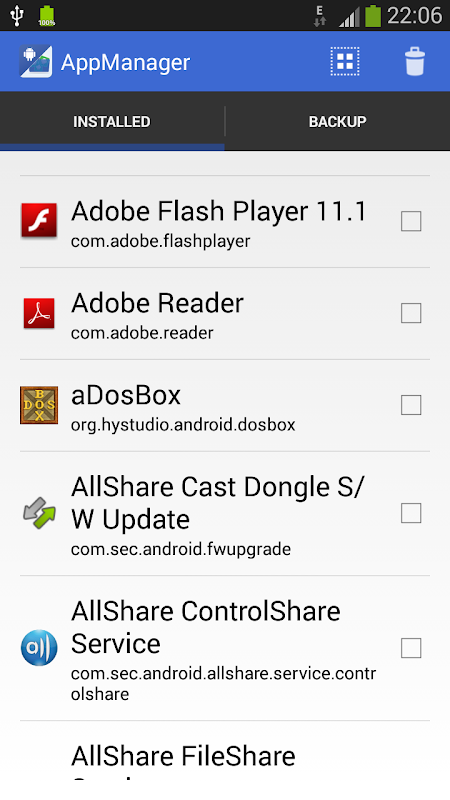 Application manager brings you way to organize and backup installed applications. Android app manager helps you to remove installed applications and to save (backup) applications you already bought on any markets for case your phone will stop working.