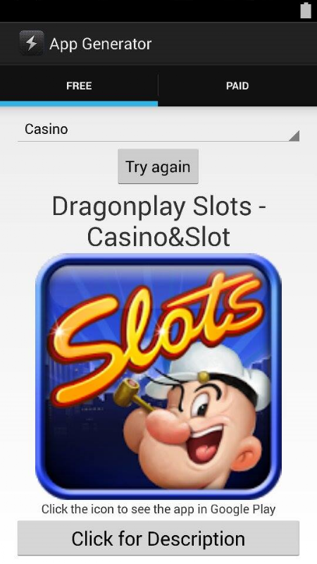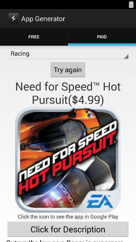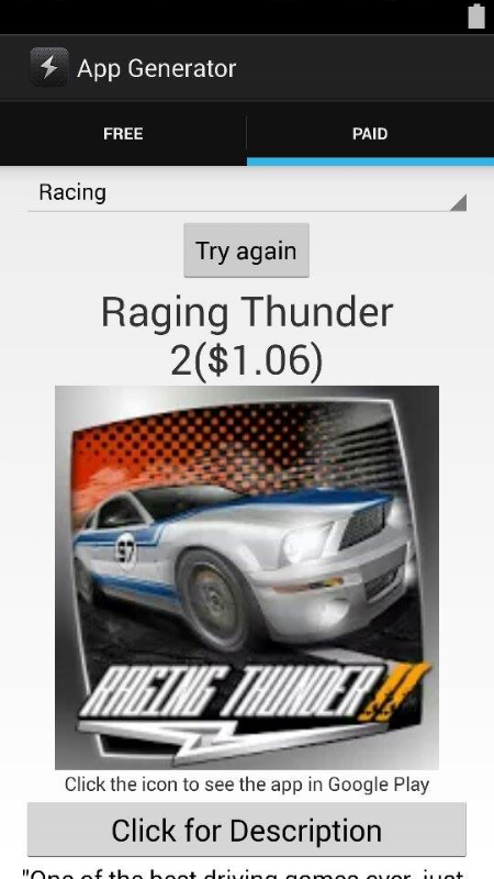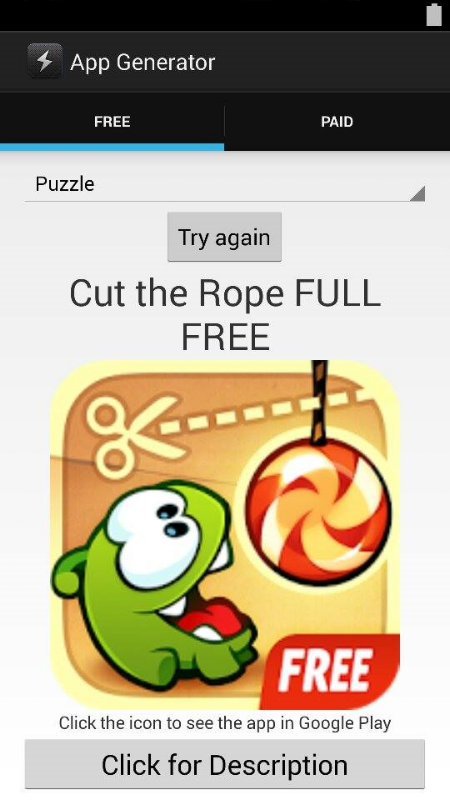 Tired of dealing with the same apps everyday with little to no diversity? Application Suggester is the solution! Application Suggester is a simple and easy-to-use application that takes in a category and randomly generates an application from Google Play within the category specified for the user to consider trying. This application is perfect for anyone who wants to try new applications but doesn't know how to begin searching for them, ESPECIALLY FOR GAMES! It's as simple as selecting one of the nearly 50 categories that interests you and then let the application do the rest! The application displays the selected application's name, icon, and description. If any application interests you, just click on the generated icon and you will be redirected to Google Play to download it. You can generate as many different apps as you want any number of times.