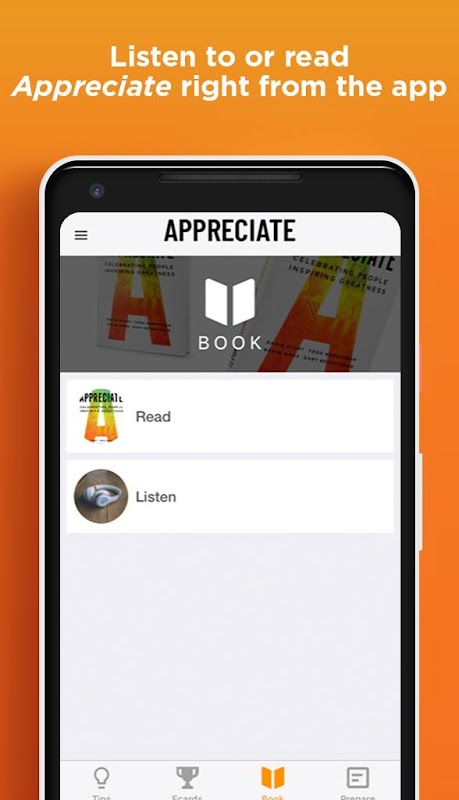 Appreciate book: Users are able to listen to the audio version of Appreciate or read the eBook version right from the app.
