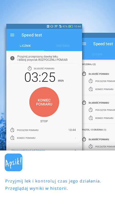 Apsik! Umożliwia korzystanie z funkcjonalności Speed test. Dzięki wbudowanemu w aplikację licznikowi możesz kontrolować czas po jakim przepisany lek zaczął działać, a twoje objawy alergiczne zostały zmniejszone.