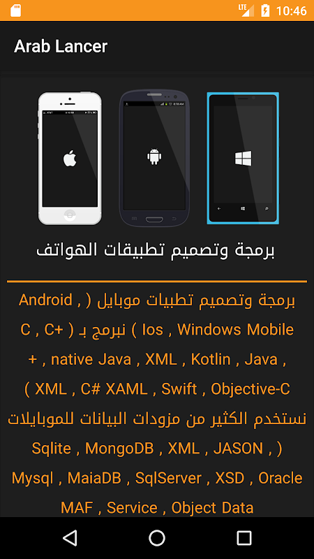 نبرمج بـ ( C , C++ , native Java XML , Kotlin , Java , XML , C# XAML , Swift , Objective-C ) نستخدم الكثير من مزودات البيانات للموبايلات ( Sqlite , MongoDB , XML , JASON , Mysql , MaiaDB , SqlServer , XSD , Oracle MAF , Service , Object Data ) .