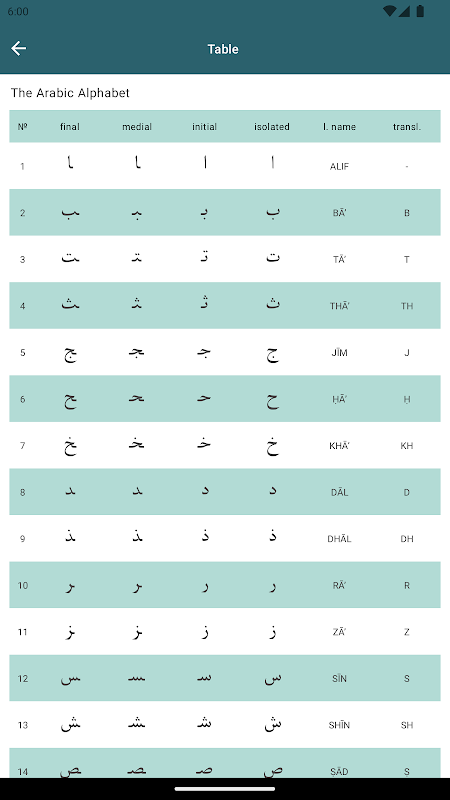 Tải xuống ứng dụng của chúng tôi ngay hôm nay và bắt đầu học cách đọc và viết tiếng Ả Rập. Bắt đầu với việc học bảng chữ cái thông qua khóa học tương tác được chia thành 27 bài học của chúng tôi. Mỗi bài học chỉ tập trung vào một chữ cái (trừ bài học đầu tiên). Mỗi chữ cái đều được nghiên cứu kỹ lưỡng với các mô tả, ví dụ, các hình thức ứng dụng khác nhau bằng văn bản cũng như cả cách phát âm. Sau khi hoàn thành tất cả các bài học, bạn sẽ thấy mình có khả năng đọc tiếng Ả Rập một cách dễ dàng và hiệu quả.