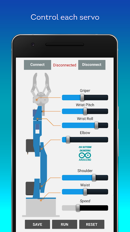 This app is for the management of a robot arm. Set up by Arduino Uno. Controlled through bluetooth.