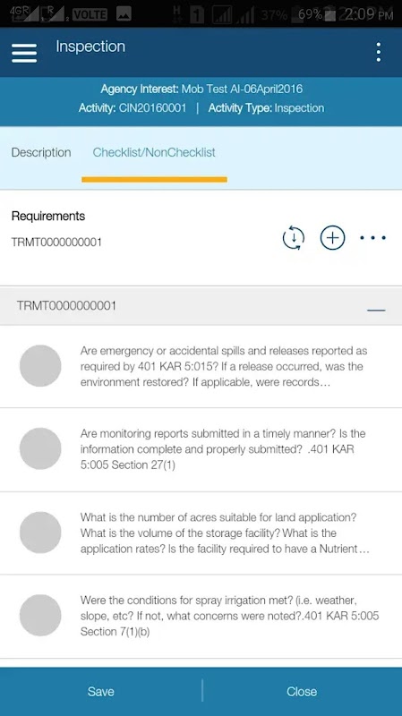 • View and update inspection details including requirement checklists and descriptions of non-compliance.