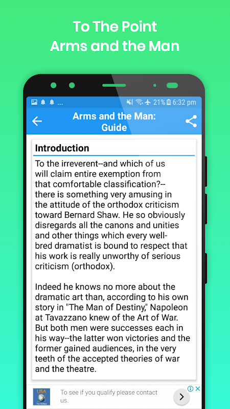 This Guide app works both online and offline, and contains 28 basic topics about one of the famous plays of George Bernard Shaw, Arms and the Man.