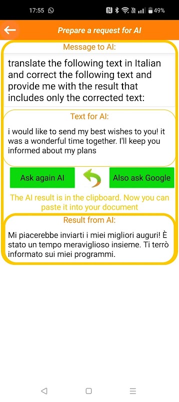 Bằng cách trả lời các câu hỏi đơn giản, bạn có thể nhanh chóng chuẩn bị yêu cầu tới AI ở cấp độ chuyên nghiệp và nhận được phản hồi ngay lập tức từ AI, ngay cả khi bạn không phải là người dùng đã đăng ký. Ví dụ: bạn có thể: chuẩn bị thư chính thức, sửa hoặc dịch văn bản của mình, tạo PROMPT chuyên nghiệp cho AI cho các nhu cầu kinh doanh khác nhau và đặt bất kỳ câu hỏi nào.... và tất cả điều này bằng 12 ngôn ngữ (tiếng Anh, tiếng Ý, tiếng Đức) , tiếng Pháp, tiếng Tây Ban Nha, tiếng Bồ Đào Nha, tiếng Nga, tiếng Ba Lan, tiếng Ukraina, tiếng Rumani, tiếng Đan Mạch, tiếng Hà Lan và tiếng Trung Quốc)!