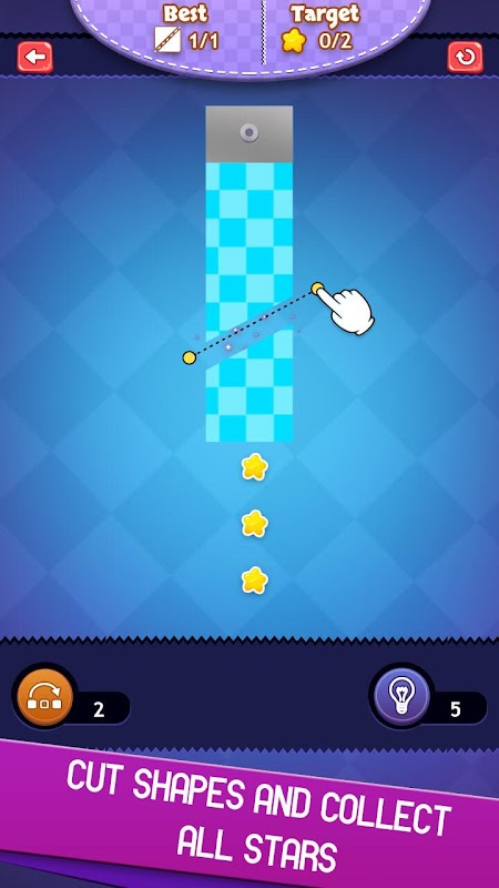 Collect as much star as you can to receive the highest score, Slice the shapes to let them fall in a way that the cut pieces catch the stars while slipping, hanging or falling down.