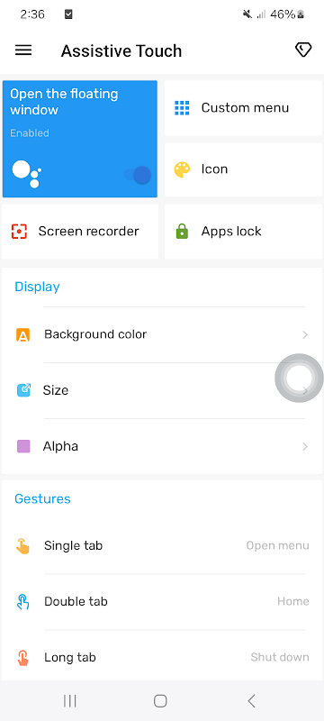 Nó cung cấp một bảng điều khiển nổi trên màn hình để điều khiển nhanh, bao gồm ghi màn hình, xóa rác, mở ứng dụng, v.v. Bạn có thể tùy chỉnh độ mờ, kích thước và màu sắc của bảng và biểu tượng theo ý muốn.