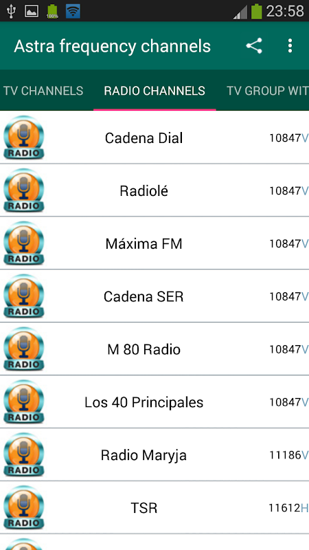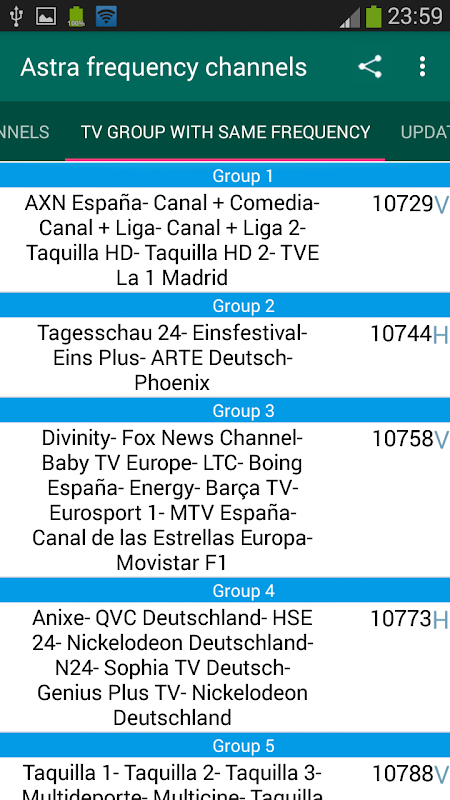 Tất cả các tần số trong các vệ tinh sau nằm trong cùng quỹ đạo 19,2 ° Est: Astra 1KR / Astra 1L / Astra 1M / Astra 1N.