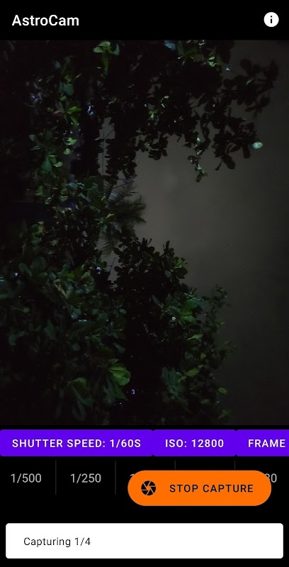 Has options to manually control shutter speed, ISO, number of light frames, and image save type (RAW/JPEG).