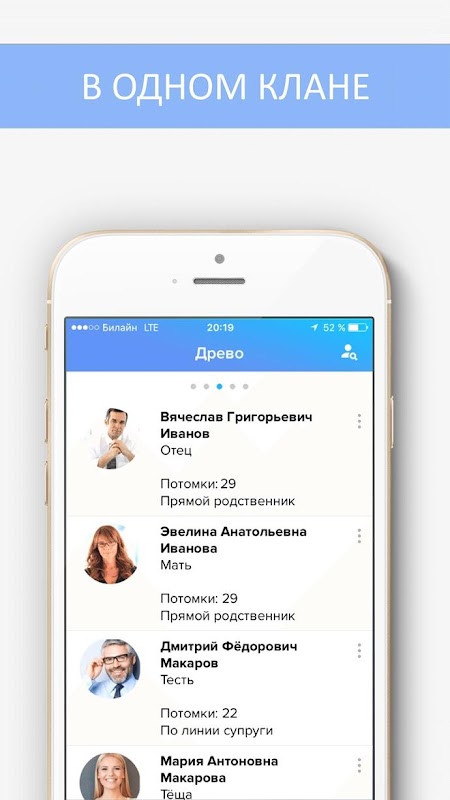 Нет необходимости и путаницы с заполнением правильных данных родственников т.к. каждый пользователь заполняет свои данные, а приложение объединяет их в кланы используя родственные связи. Достаточно одного общего родственника, чтобы кланы объединились.