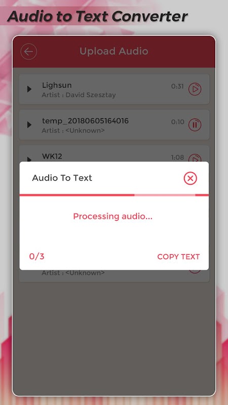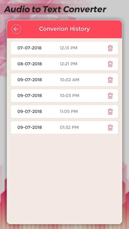 Audio To Text ứng dụng cung cấp người dùng để có được âm thanh của họ để nhắn tin cho mẫu. Bây giờ, với 'âm thanh to Text' bạn có thể chuyển đổi lưu ý giọng nói sang văn bản một cách chính xác! Nó chuyển đổi âm thanh từ tất cả các ứng dụng. Dễ dàng chuyển âm thanh vào văn bản trong vòng một thời gian với tất cả mới âm thanh sang văn bản Ứng dụng Android. Bạn cũng có thể sử dụng như là lời nói sang văn bản bằng giọng nói ứng dụng, chỉ cần ghi lại và dịch văn bản.