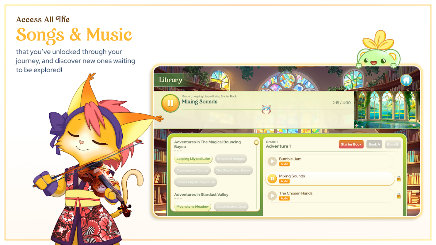✦ Truy cập Thư viện Hoàn chỉnh - Thưởng thức hơn 300 cuộc phiêu lưu và câu chuyện âm nhạc bổ sung cho việc học của bạn, củng cố các khái niệm giữa các bài học.