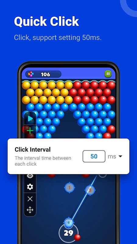 Auto Clicker là một công cụ nhấp tự động và nó cũng là một công cụ tự động mô phỏng cách nhấp trên màn hình điện thoại di động. Người dùng chỉ cần thiết lập thời gian, sau đó nó sẽ tự động nhấp hoặc trượt bất kỳ vị trí nào.